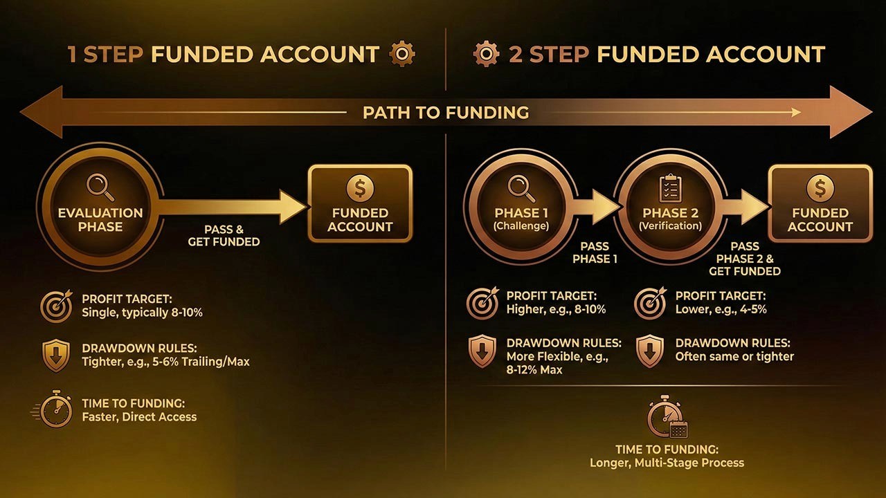 Understanding the difference between 1 step and 2 step funded account models helps traders choose the right challenge.